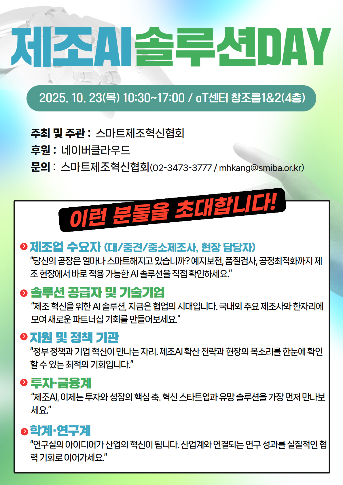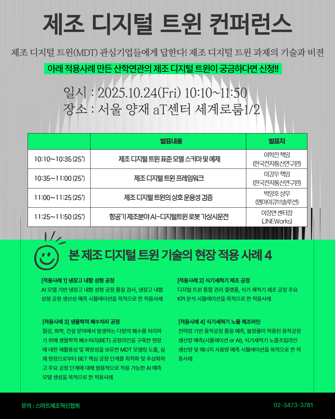 | 오전 | 제조AI 솔루션 DAY | 제조AI 솔루션 DAY | KVCA 사업화 유망기술 IR 및 오픈 이노베이션 파트너링 | 제조 디지털 트윈 컨퍼런스 | 2025 스마트 제조 표준 설명회 | |